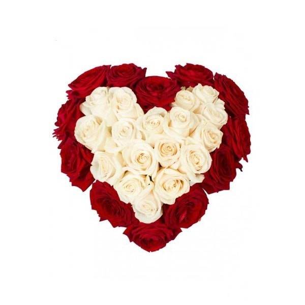 Цветочная композиция выложена в форме сердца, в середине находятся белые розы, обрамленные рядом из красных. Белые цветы издавна считаются отличным способом передать нежность и чистоту, а красные - страстную любовь и желание. Букет прекрасно передает светлую любовь, которую хочет испытать каждая женщина. Возлюбленная обрадуется такому подарку и поймет без слов все, что вы хотите ей сказать. Форма сердца – дополнительный непрозрачный намек, а запах роз поднимает настроение на целый день.